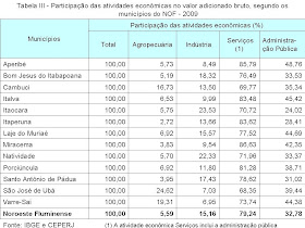 De acordo com a Tabela III, a atividade econômica mais representativa no Valor Adicionado Bruto (VAB) 2009 (PIB = VAB + Impostos sobre produtos) foi Serviços, com 79,24%. Miracema apresentou nesta atividade econômica o maior destaque da região, 86,63%.