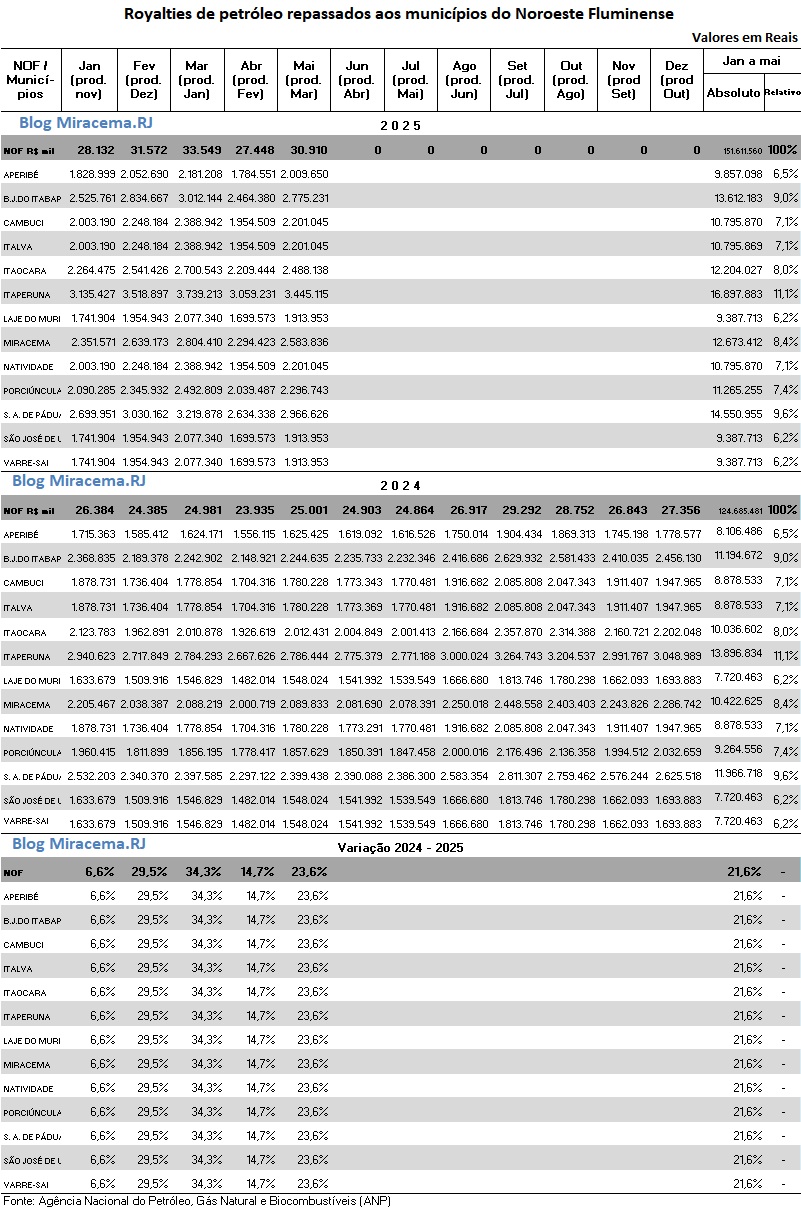 No acumulado do ano, janeiro a maio, aumentaram 21,6% na comparação com o mesmo período do ano anterir, propiciando R$ 124,685 milhões para os municípios do Noroeste Fluminense, distribuídos para cada um dos 13 municípios da região de acordo com a última coluna do primeiro quadro da tabela abaixo.