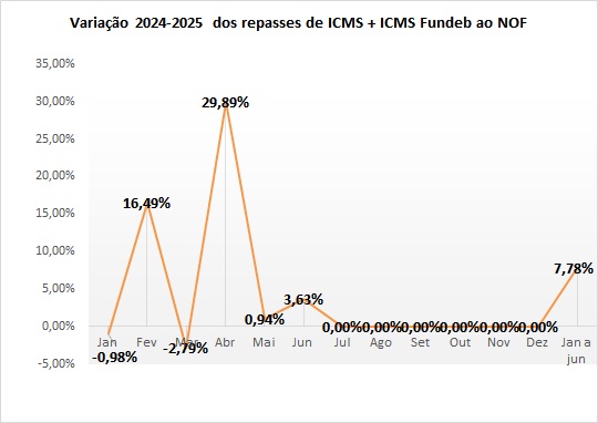 Conforme o gráfico acima, os repasses de ICMS e ICMS Fundeb aos municípios do Noroeste Fluminense recuaram -0,98% em janeiro e -2,79% em março, e aumentaram 16,49% em fevereiro, 29,89% em abril, 0,94% em maio e 3,63% em junho na comparação com estes mesmos meses do ano anterior.